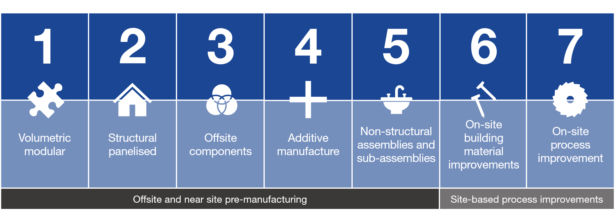 Recognising the importance of standardising terminology, last year the Ministry for Housing Communities and Local Government (MHCLG) published the MMC definition framework. For housebuilders this identifies seven categories of MMC, as seen in Figure 1, the first five of which apply offsite and near site pre-manufacturing techniques.