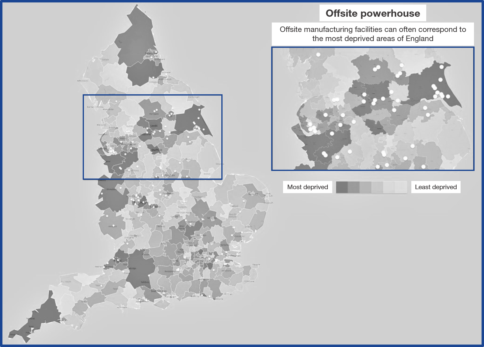 Similarly, by embracing solutions that are manufactured beyond the confines of the site hoardings, investment can be channelled towards local SMEs in supporting growth in areas of economic deprivation. The UK has a landscape of regional imbalance, as seen in Figure 3, which has typically hampered the ability of SMEs in many areas to grow, recruit, innovate and be profitable.