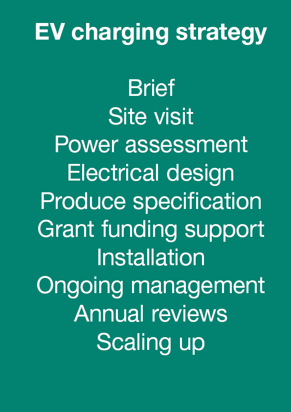 Only once you have considered what the property operator is trying to achieve for their EV charging installation will you be in a position to begin devising your EV charging strategy, which should include all the elements shown on the right.