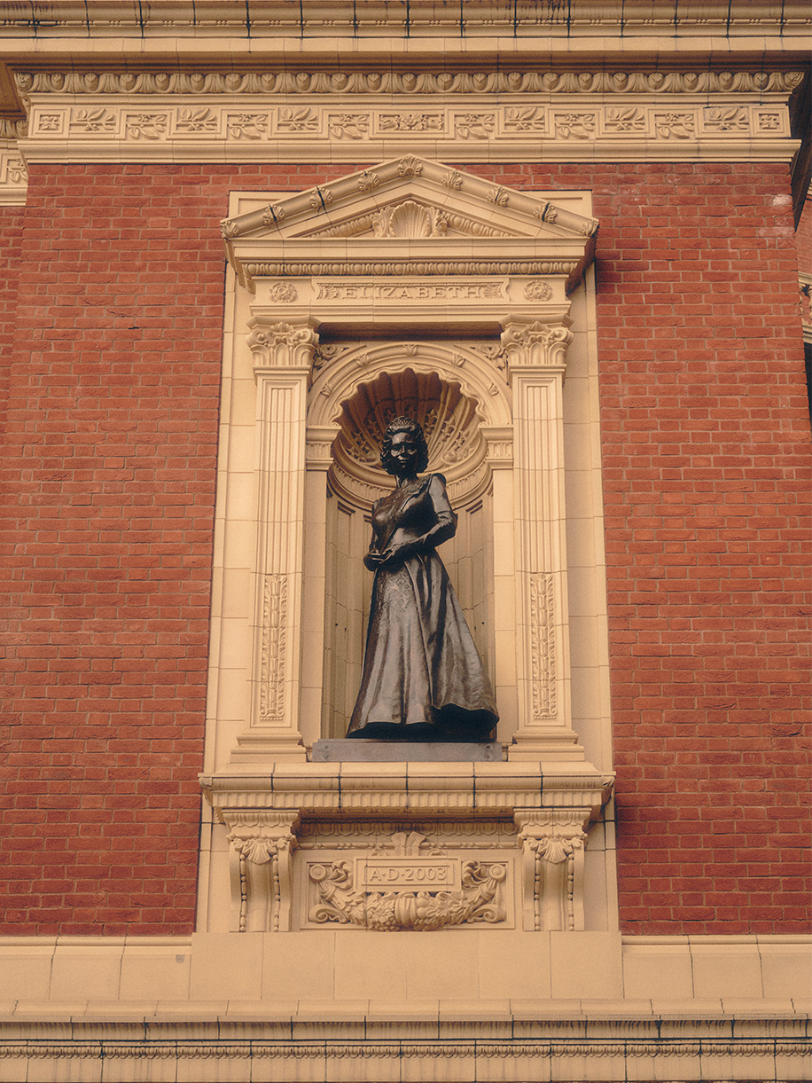 South porch (below) adorned with the Queen Elizabeth II sculpture (above)