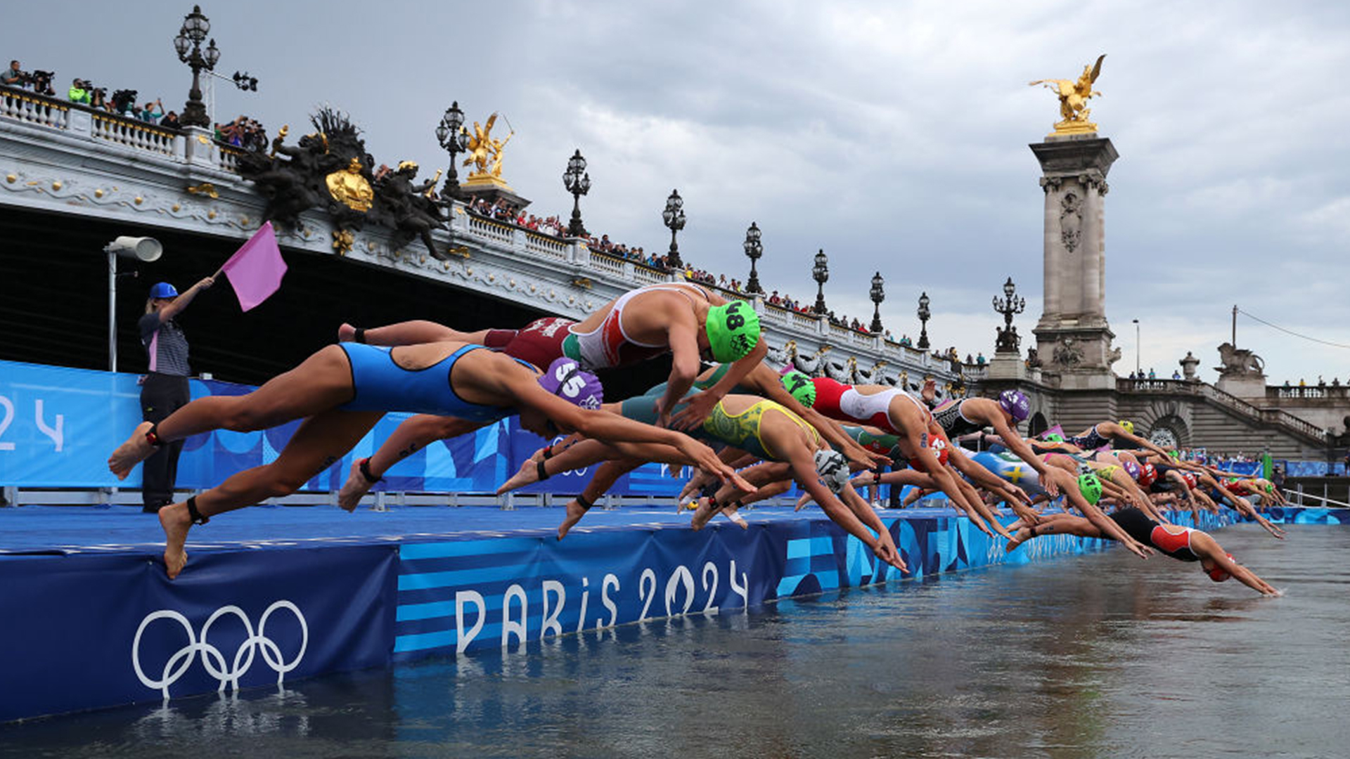 Triathlon swimmers in the Seine at the Paris Olympics 2024