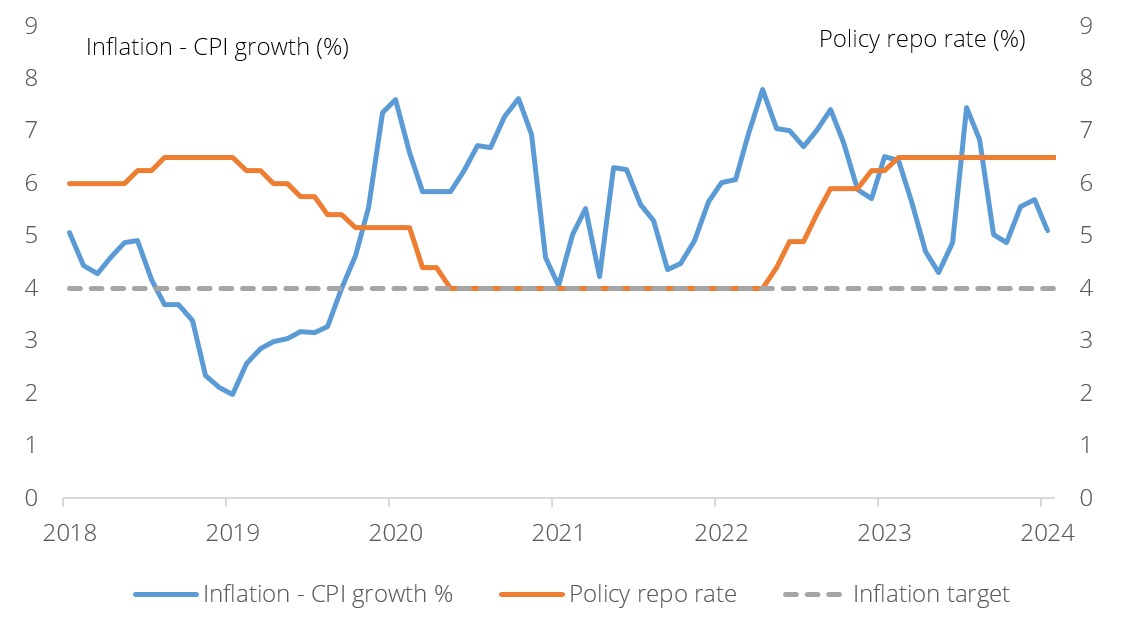 Interestingly, although interest rates have been sharply increased in India – as they have elsewhere around the world – Figure 2 highlights the relatively modest impact this has had on the country’s building sector, with its Construction Activity Index (CAI) starting to rise above the global figure at the same time as rates rose. Figure 4 shows the Reserve Bank of India (RBI) response to accelerating inflation, with the policy rate now back at 6.5%; incidentally, the same as it was in 2018.